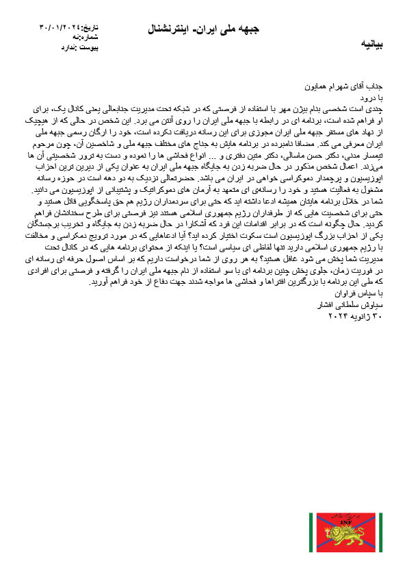 چندی است شخصی بنام بیژن مهر با استفاده از فرصتی که در شبکه تحت مدیریت جنابعالی یعنی کانال یک، برای او فراهم شده است، برنامه ای در رابطه با جبهه ملی ایران را روی آنتن می برد. این شخص در حالی که از هیچیک از نهاد های مستقر جبهه ملی ایران مجوزی برای این رسانه دریافت نکرده است، خود را ارگان رسمی جبهه ملی ایران معرفی می کند. مضافا نامبرده در برنامه هایش به جناج های مختلف جبههملی و شاخصین آن، چون مرحوم تیمسار مدنی، دکتر حسن ماسالی، دکتر متین دفتری و … انواع فحاشی ها را نموده و دست به ترور شخصیتی آن ها میزند. اعمال شخص مذکور در حال ضربه زدن به جایگاه جبهه ملی ایران به عنوان یکی از دیرین ترین احزاب اپوزیسیون و پرچمدار دموکراسی خواهی در ایران می باشد. حضرتعالی نزدیک به دو دهه است در حوزه رسانه مشغول به فعالیت هستید و خود را رسانهی ای متعهد به آرمان های دموکراتیک و پیشتیبانی از اپوزیسیون می دانید. شما در خلال برنامه هایتان همیشه ادعا داشته اید که حتی برای سردمداران رژیم هم حق پاسخگویی قائل هستید و حتی برای شخصیت هایی که از طرفداران رژیم جمهوری اسلامی هستند نیز فرصتی برای طرح سخنانشان فراهم کردید. حال چگونه است که در برابر اقدامات این فرد که آشکارا در حال ضربه زدن به جایگاه و تخریب برجستگان یکی از احزاب بزرگ اپوزیسیون است سکوت اختیار کرده اید؟ آیا ادعاهایی که در مورد ترویج دمکراسی و مخالفت با رژیم جمهوری اسلامی دارید تنها لفاظی ای سیاسی است؟ یا اینکه از محتوای برنامه هایی که در کانال تحت مدیریت شما پخش می شود غافل هستید؟ به هر روی از شما درخواست داریم که بر اساس اصول حرفه ای رسانه ای در فوریت زمان، جلوی پخش چنین برنامه ای با سو استفاده از نام جبهه ملی ایران را گرفته و فرصتی برای افرادی که طی این برنامه با بزرگترین افتراها و فحاشی ها مواجه شدند جهت دفاع از خود فراهم آورید.